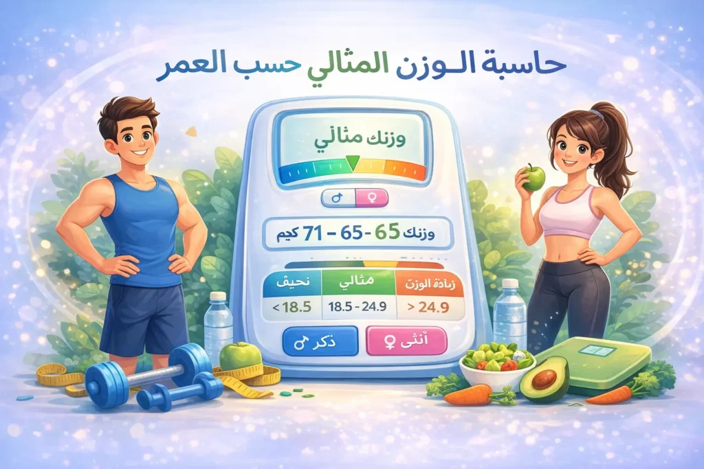 تساعدك حاسبة الوزن المثالي حسب العمر على فهم نطاق الوزن الصحي المناسب لك بناءً على عمرك وطولك وجنسك. يبحث الكثير من الأشخاص عن الوزن الصحي حسب العمر لأنهم ببساطة يريدون معرفة: هل أنا ضمن النطاق الصحي؟ أم أعاني من زيادة أو نقص في الوزن؟ بدلًا من التخمين، تعتمد هذه الحاسبة على معادلة مؤشر كتلة الجسم (BMI) إلى جانب التوصيات الصحية المرتبطة بالعمر لتقديم تقدير شخصي سهل الفهم.
